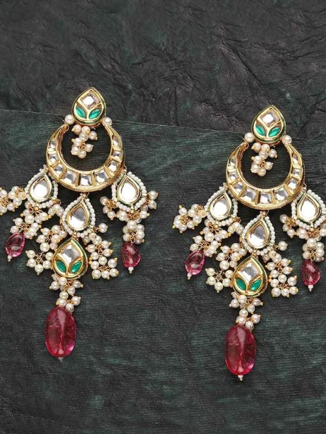 Green & Pink Stone Kundan Chandbali Earrings
