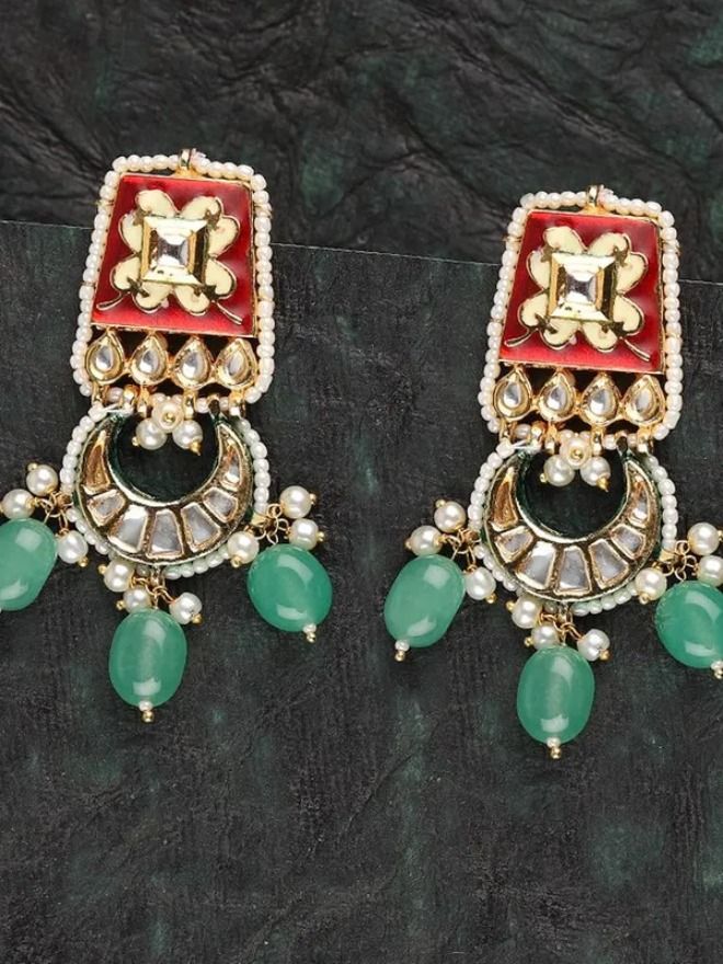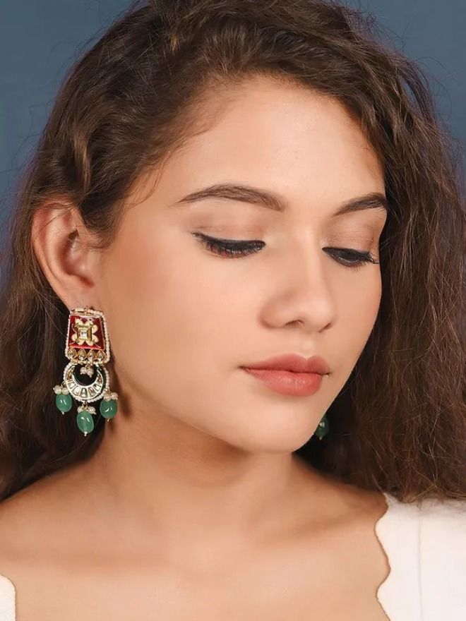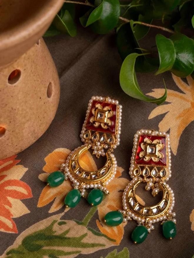 Add a splash of vibrant elegance to your look with these exquisite Handcrafted Gold Plated Enamel Ethnic Earrings. Meticulously handcrafted, these earrings feature intricate kundan work highlighted with rich red and green enamel detailing, evoking timeless royal charm. The enamel finish enhances the traditional design with a touch of artistic flair, making them a perfect statement piece for festive occasions, weddings, or cultural events. Lightweight and elegant, they blend tradition with a modern aesthetic.