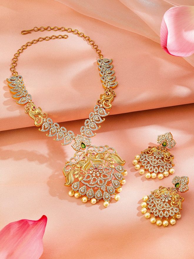 Adorn yourself with the Rubans 24K Gold-Plated Jewelry Set, featuring intricate ruby, emerald, and cubic zirconia embellishments paired with delicate pearl accents for a timeless traditional appeal.