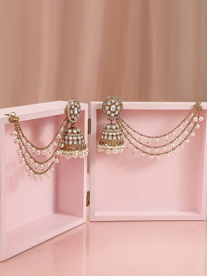 Elegant 18K gold-plated kan chain jhumka earrings adorned with kundan and zirconia details, paired with cascading white pearl beads, offering a luxurious and traditional appeal.