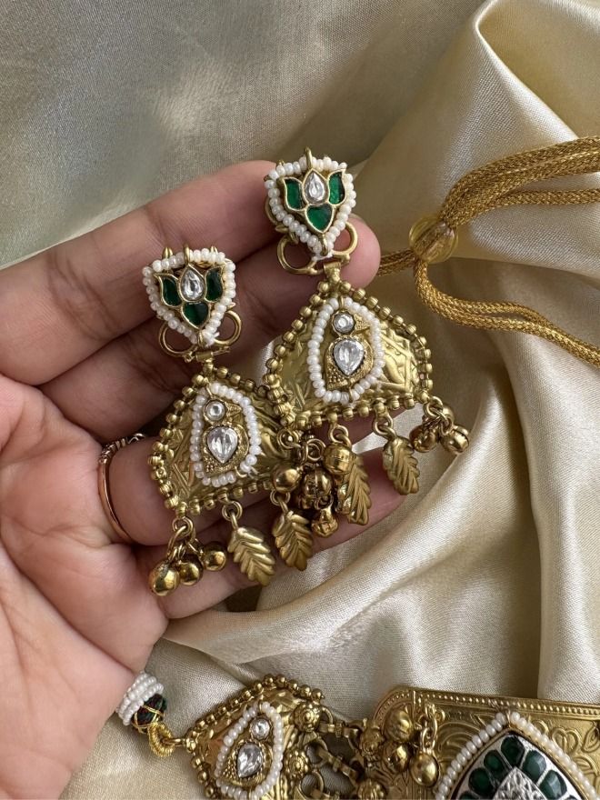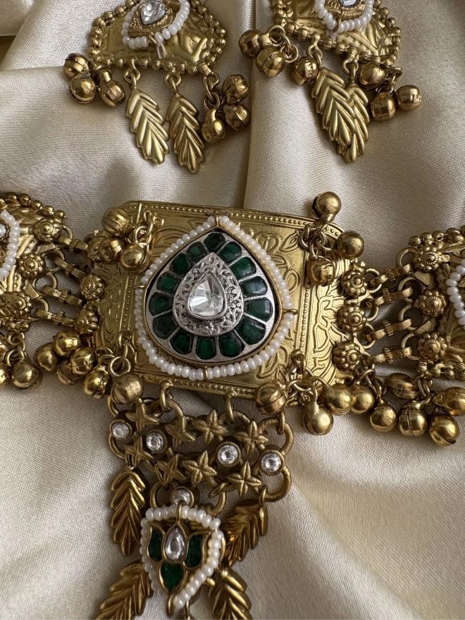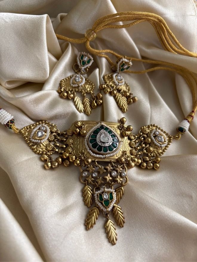 This striking fusion jewelry set showcases a harmonious blend of traditional artistry and contemporary design. The choker necklace takes center stage with a central rectangular plaque intricately detailed with a deep teal or green gemstone surrounded by delicate white accents and a border of smaller green stones. This central motif is further embellished with textured gold work and tiny pearl-like beads along its edges.