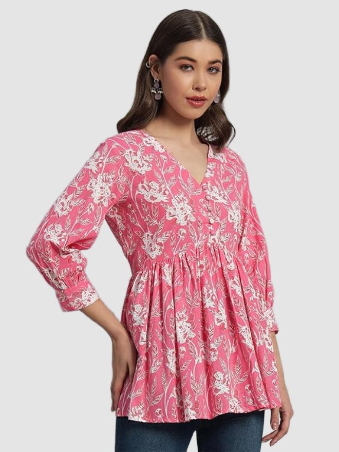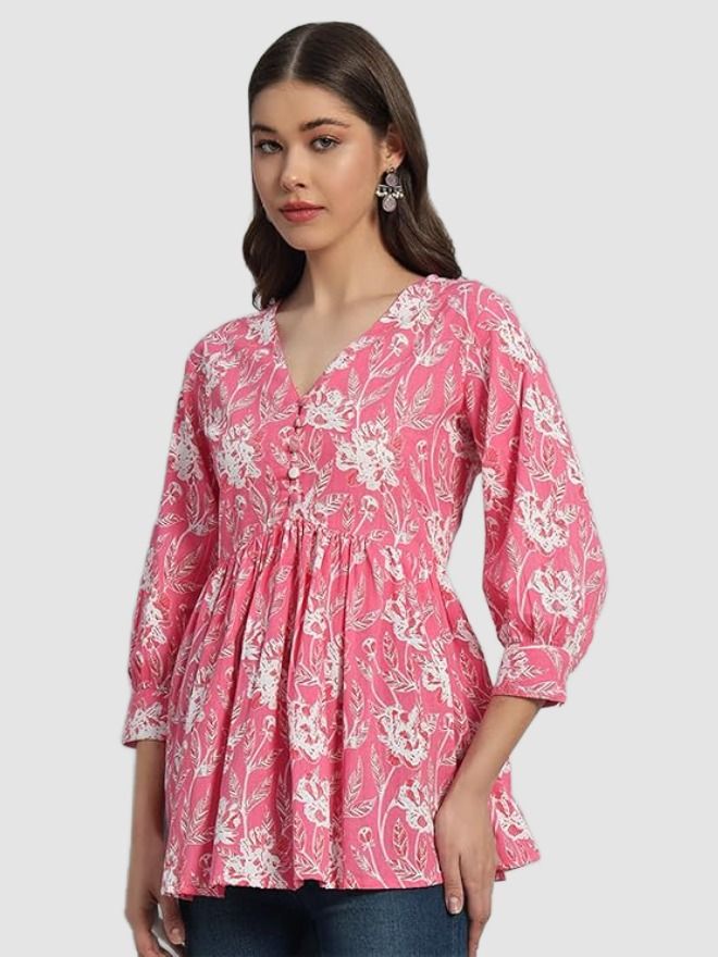 • Model: Cotton Printed V-Neck Flared Top with 3/4th Sleeves (Pink_Extra Large)
