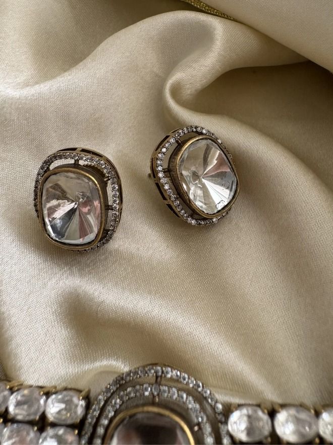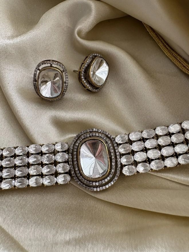 The Luxe Polki Choker Set is truly captivating, featuring a blend of Victorian-inspired metalwork, shimmering moissanite polkis and diamonds that exude timeless luxury. This exquisite set is the ideal choice for festive celebrations and weddings, effortlessly combining elegance with a touch of regal sophistication. The matching stud earrings beautifully complement the choker, enhancing the set’s overall charm. It’s a statement piece that elevates any traditional ensemble with grace and grandeur