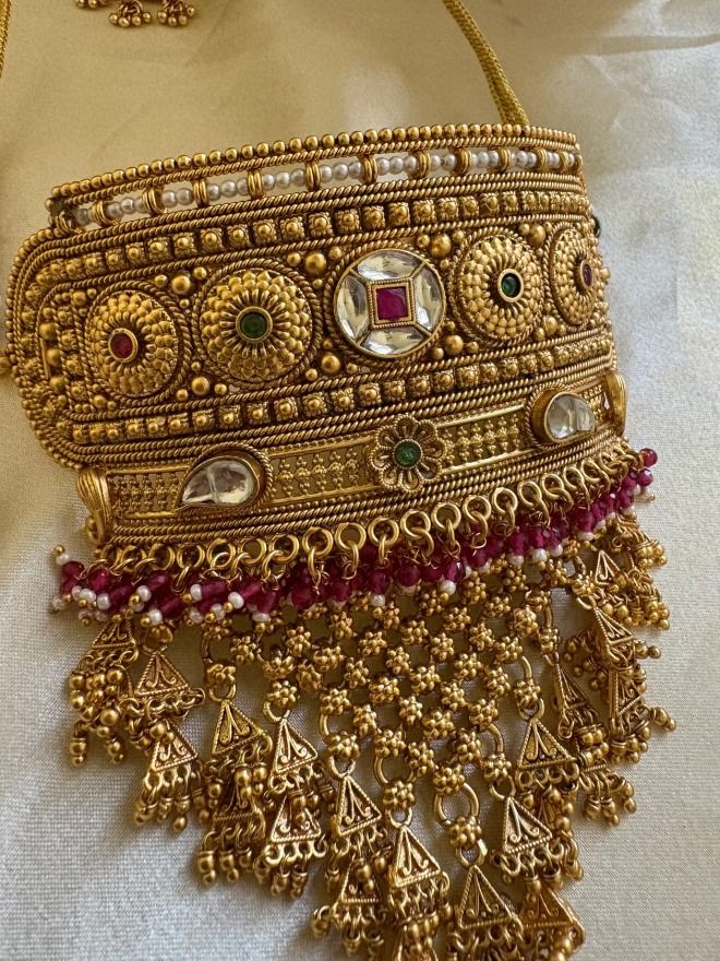 Indulge in the grandeur of Rajasthani heritage with this breathtaking Rajwadi Choker Necklace Set. Showcasing a mesmerizing design, it is adorned with vibrant pachi kundan stones and intricate motifs that exude timeless elegance. This exquisite set includes matching Jhumka Earrings and a beautifully crafted Maangtikka, completing the regal look. The rich hues, elaborate craftsmanship, and opulent gold plating make this set a perfect choice for brides, festive celebrations, or any special occasion. Elevate your ensemble with this stunning blend of tradition and luxury, crafted to leave an everlasting impression.