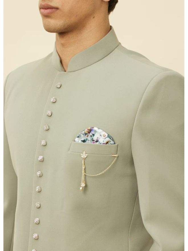 Green solid regular-fit blazer, has a notched lapel, single-breasted with double button closures, long sleeves, one welt pocket, and two flap pockets, and a double-vented back hem