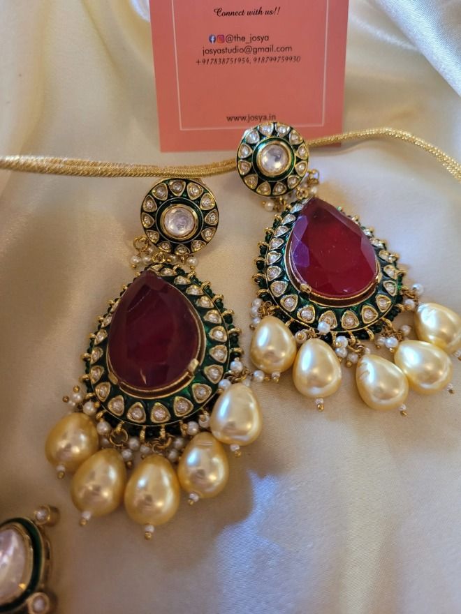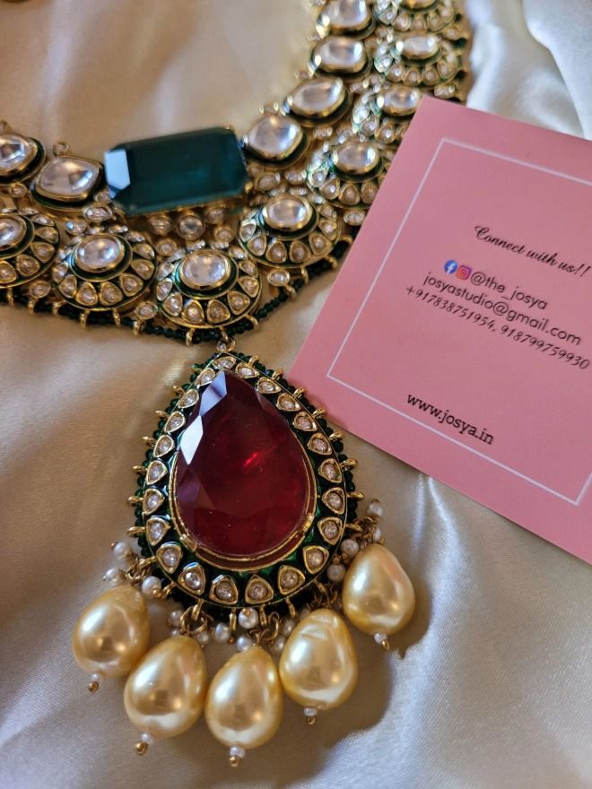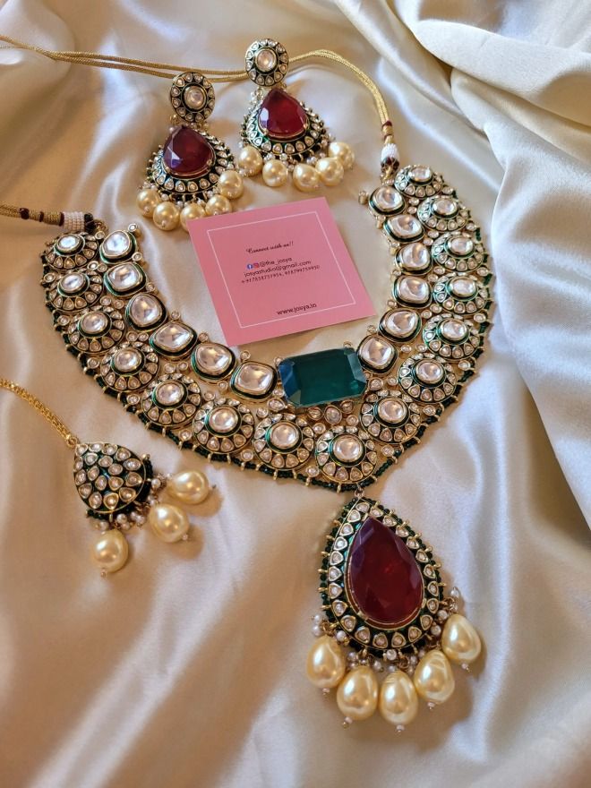 Immerse yourself in the rich heritage and elegance of the Naavya Bridal Necklace Set, a timeless expression of traditional Indian artistry. Each piece is crafted with meticulous attention to detail, showcasing a harmonious blend of deep ruby-like doublet stones and the captivating green doublet centerpiece, expertly designed to draw the eye. The necklace is further enhanced by intricate moissanite polki stones, set against the backdrop of delicate meenakari work, adding a layer of sophistication to the overall design.