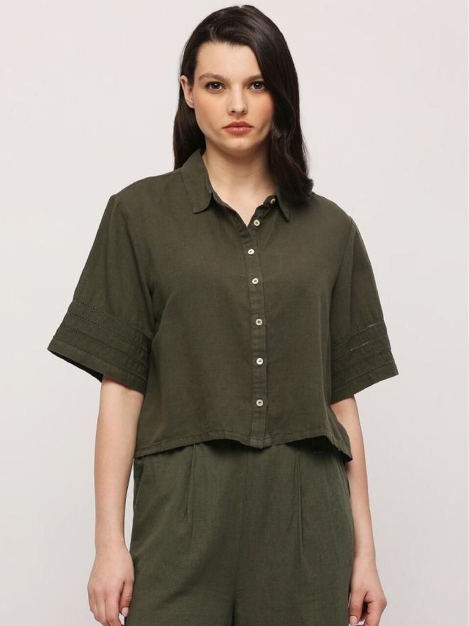 Refresh your warm-weather wardrobe with our women’s olive-hued solid woven shirt, designed for effortless elegance and everyday ease. Crafted from a premium blend of breathable linen and soft cotton, this shirt is your go-to for staying cool and stylish. Delicate lace accents on the short sleeves lend a feminine flair, while the buttoned-up front adds a touch of sophistication. The comfort cropped fit creates a flattering silhouette that pairs perfectly with high-waisted trousers, skirts, or denim.