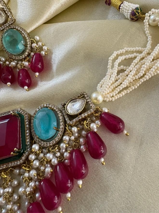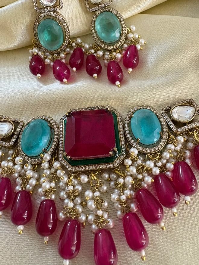 This set features a beautifully designed choker necklace and matching earrings, perfect for adding a touch of regal elegance to your bridal or festive attire. The necklace showcases a captivating arrangement of intricate AD work, with each piece adorned with meticulously set in American diamond, renowned for their detailed craftsmanship and timeless appeal. The set features striking semi-precious stones in a captivating blend of deep ruby red and serene turquoise blue, creating a mesmerizing contrast. Delicate pearl drops and strands enhance the overall design, adding a touch of sophistication and grace.