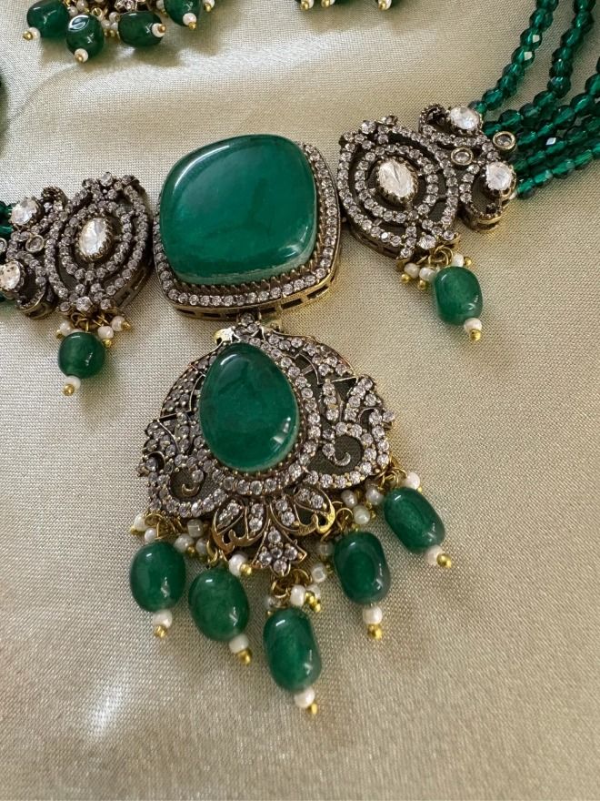This exquisite set exudes vintage charm and sophisticated glamour, perfect for special occasions. The choker features multiple strands of emerald green onyx beads, adding rich texture and a vibrant pop of color. Intricately designed pendants with large semi-precious stones create a captivating focal point, enhanced by delicately set polki and AD stones for a subtle shimmer. The antique Victorian polish on the metalwork lends a timeless allure, while matching earrings complete the ensemble with coordinated elegance.