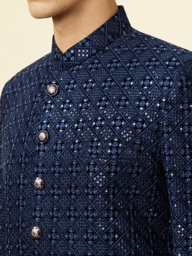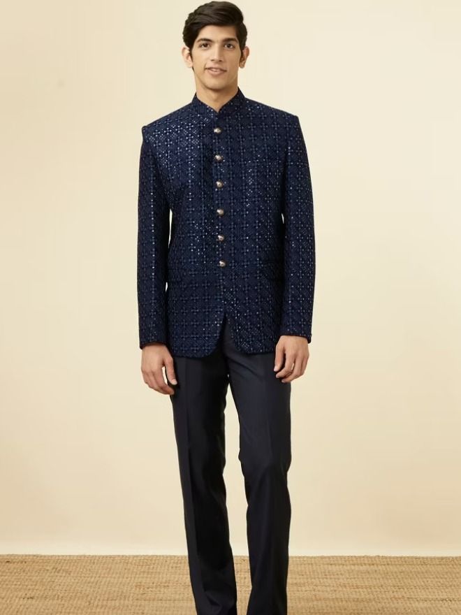 Featuring floral motifs within grid patterns, beautifully embroidered and adorned with sequins, this royal blue suit is a showstopper. The suit's Jodhpuri style, accented with filigree buttons, makes it ideal for upscale events. Pair with sleek silver jewellery and shiny dress shoes for a glamorous ensemble.