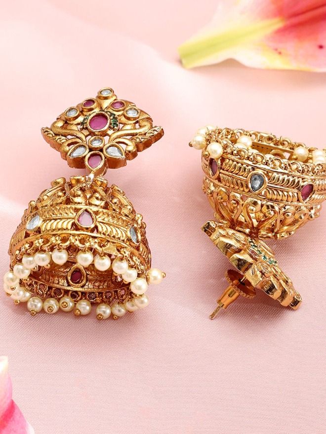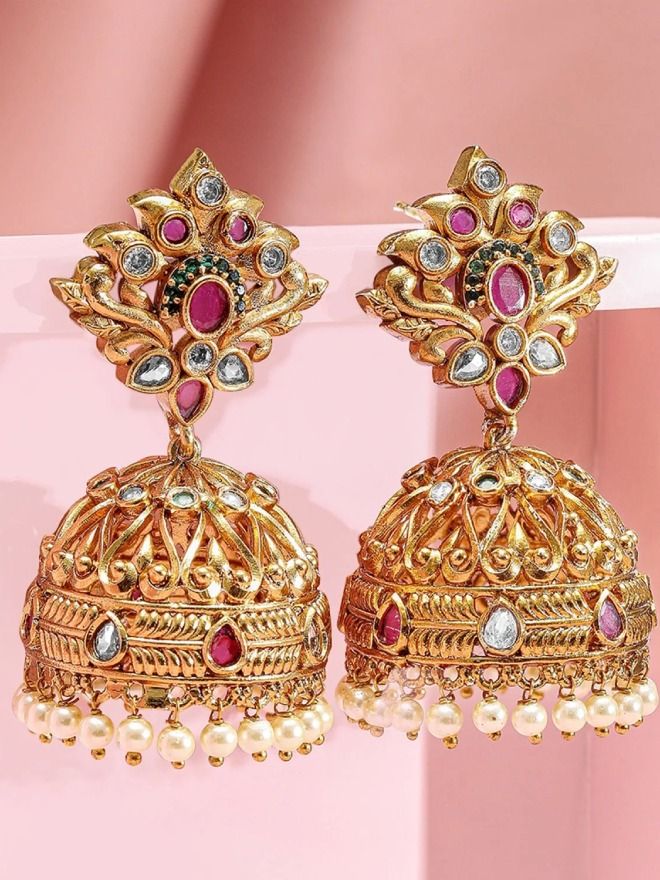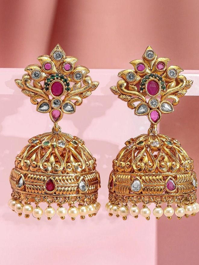 Earrings : These Royal Gold-Plated Pearl & Stone Jhumka feature intricate studding in ruby pink and emerald green accents. Designed with a dome-shaped jhumka and adorned with pearl drops, they offer a regal look.