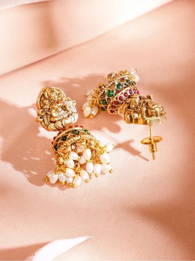 Jewellery Set : This 22K gold-plated temple necklace set features a divine Lakshmi motif, ruby and emerald stones, mint green and white beaded drops, and matching earrings—ideal for women & girls for festive and wedding looks.