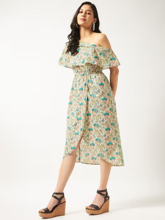 Curate a stunning look with this dress. Made with the finest material, this one-shoulder dress features half sleeves. Style it with mules and a sling bag to complete the ensemble.