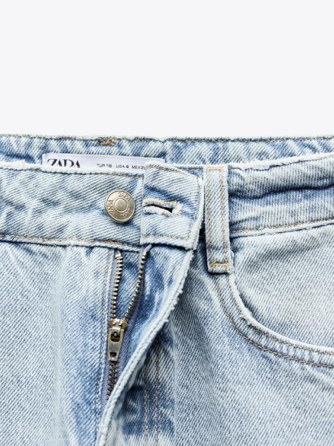 High-waist ankle-length jeans with five pockets. Straight leg with a raw hem. Zip fly and metal button fastening.